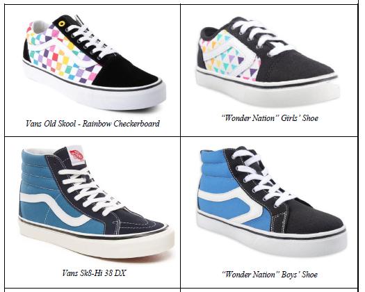 同年 11 月,Vans 在加利福尼亚联邦法院起诉沃尔玛,指控这家零售巨头通过销售其 20 多种鞋的山寨版侵犯其商标。投诉称,所有沃尔玛鞋的价格都不到 20 美元,而且与 60 美元的 Vans 鞋 " 便宜、做工差、令人困惑地相似 "  。诉讼称,沃尔玛 " 以廉价、低质量、相似的鞋子充斥市场,损害了 Vans 的商誉和声誉。"Vans 列举了一些与 Vans 产品非常相似的 Walmart 运动鞋设计示例,包括 K8-HI 和 Old Skool 鞋。投诉还称,沃尔玛将这些鞋作为 " 滑板 " 或 " 复古 " 运动鞋销售,以暗示与 Vans 的关系,后者于 1970 年代首次在南加州的滑板爱好者中流行起来。