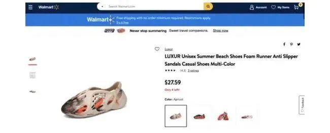 去年 4 月,Yeezy 对沃尔玛和其第三方卖家提起诉讼,指控其销售和 Yeezy Foam Runner 非常相似的鞋子。沃尔玛方表示这双 Foam Runner 并非沃尔玛产品,而是第三方在平台贩售,并对这双鞋进行了紧急下架处理。