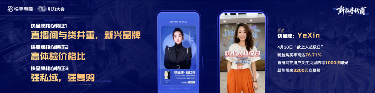 目前,已有众多快品牌在快手电商实现高速成长。2021年12月入驻快手的主播叶歆推出的快品牌“YeXin”,月GMV从最初的200万增长至今年的1000万+,客单价超过700元。在今年4月30日的“歆上人超级日”活动中,叶歆的粉丝购买率更是高达76.71%,直播间在用户关注页里的每1000次曝光就能带来3200元的交易额。